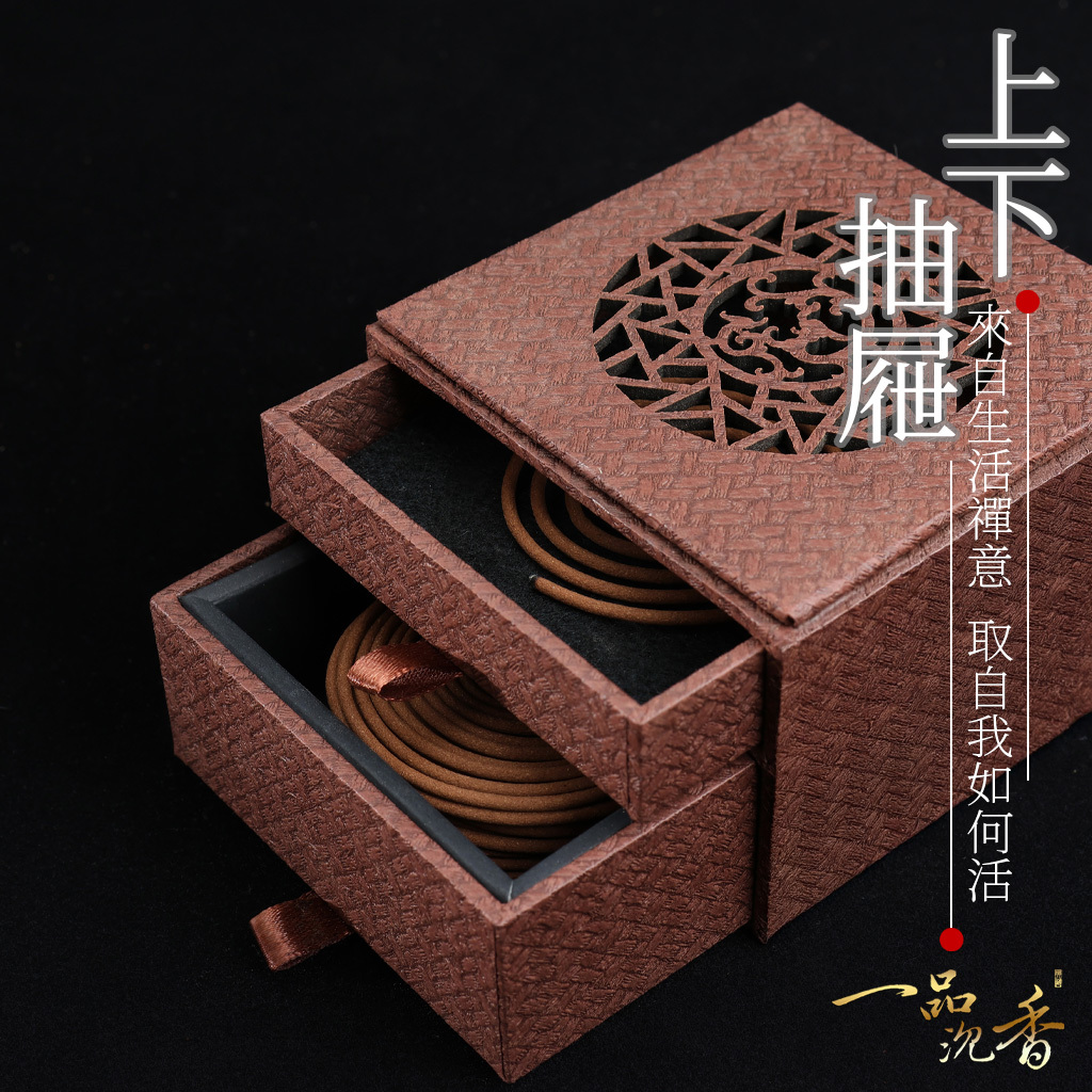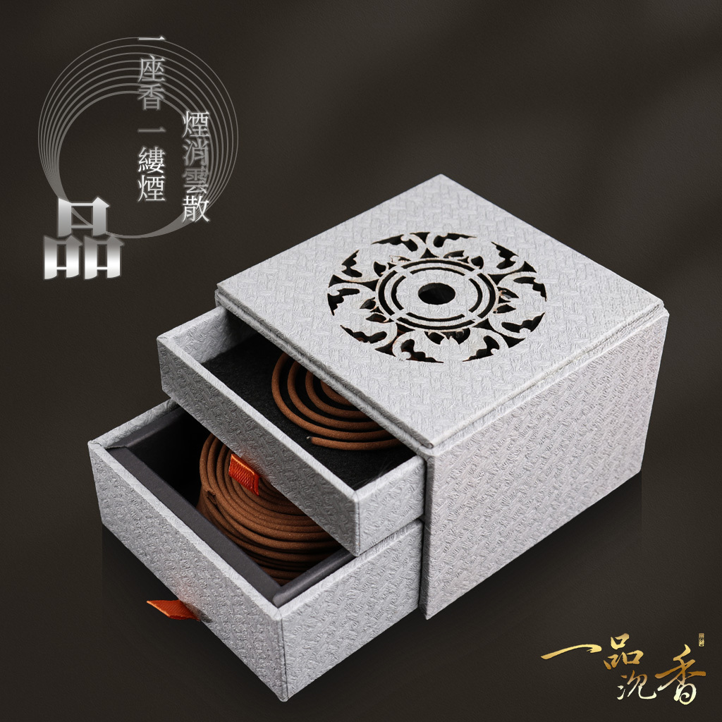 上下抽屜盤香座設計巧妙,上層可平穩安放盤香燃燒,下層抽屜則用於收納香品或承接香灰,實用便利又整潔,造型典雅大方,為品香增添雅致氛圍。