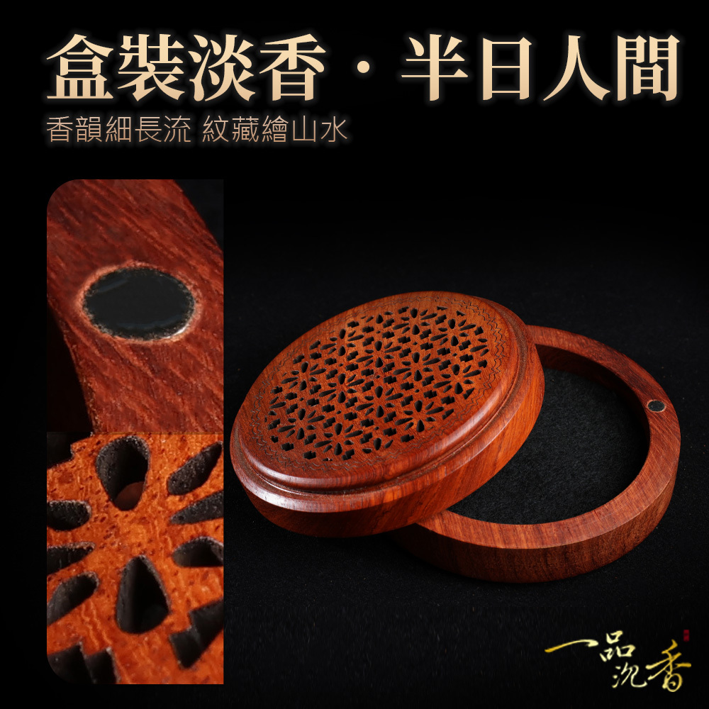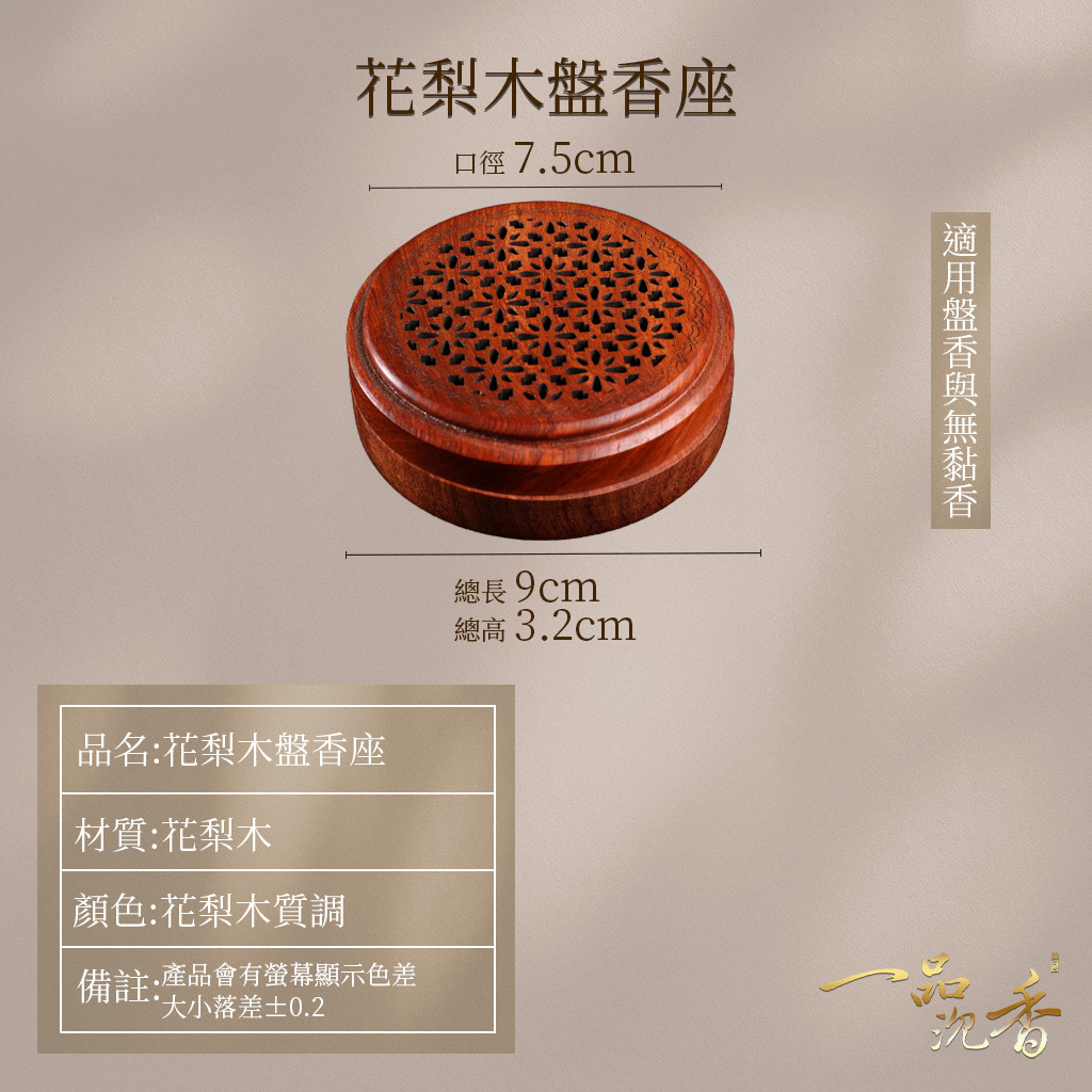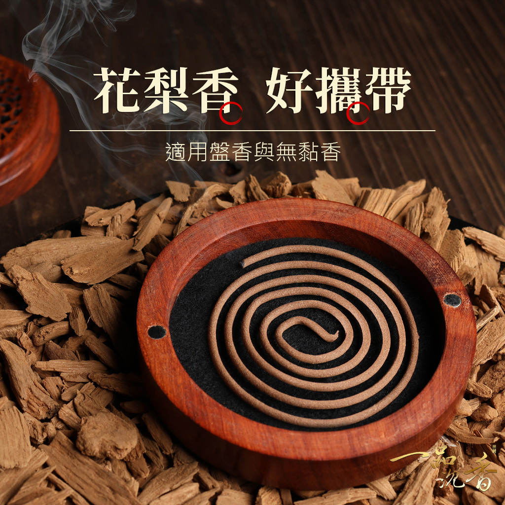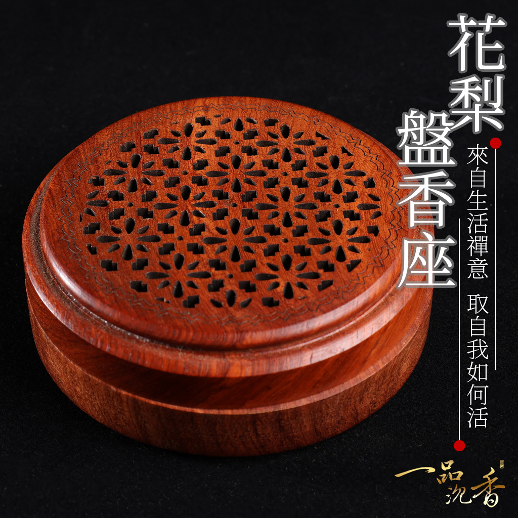 花梨木盤香座以天然花梨木製作,木質細膩溫潤,色澤沉穩雅麗,可平穩承放盤香,燃時香煙清雅縈繞,兼具實用與觀賞性,為品香空間增添古樸高雅的氛圍