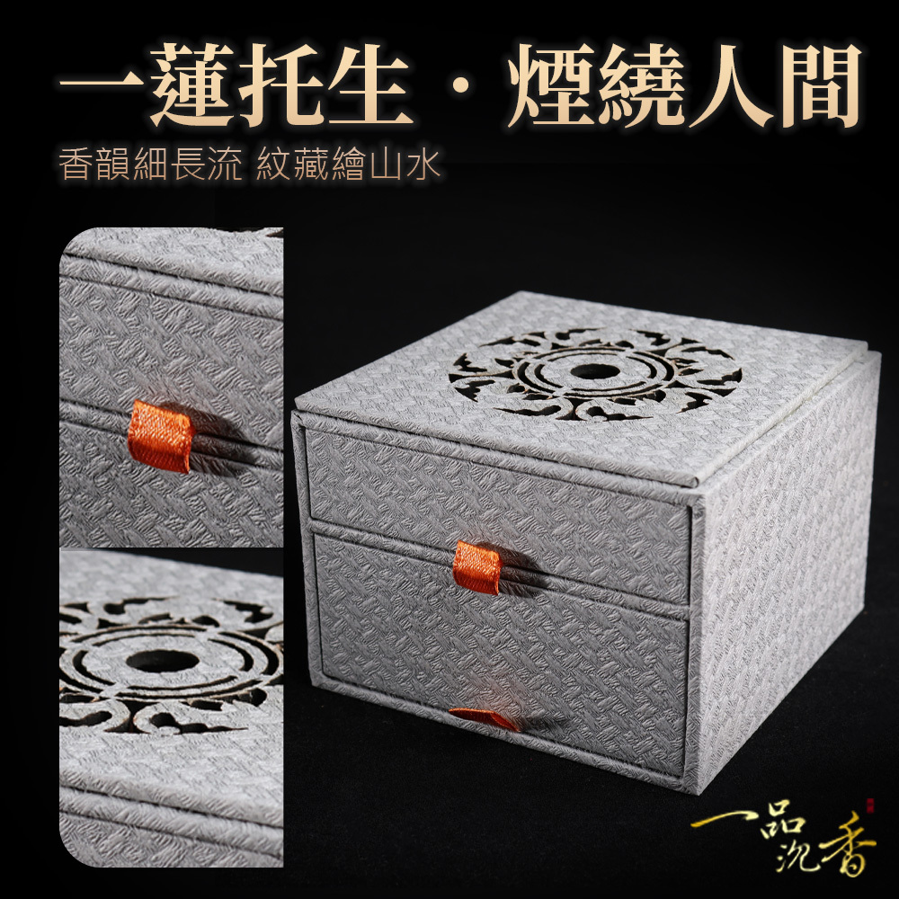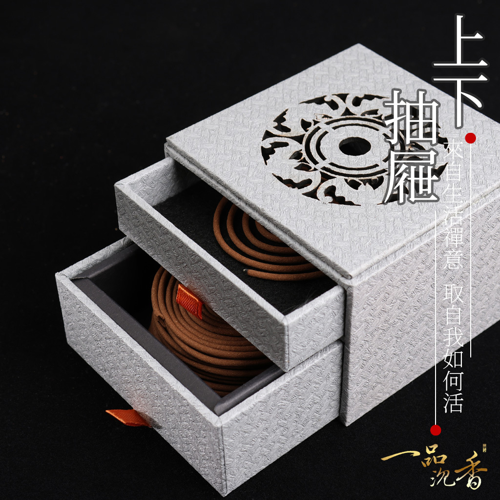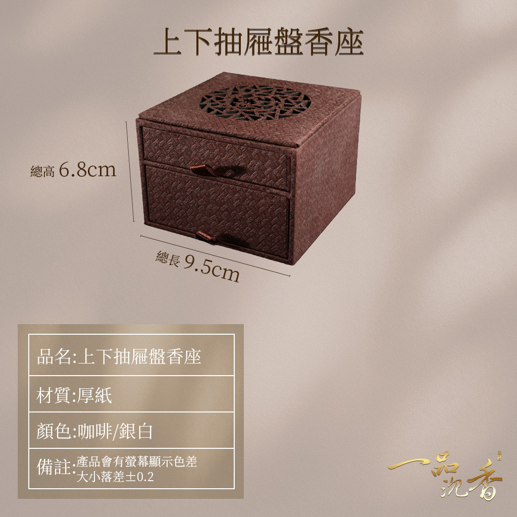 上下抽屜盤香座設計巧妙,上層可平穩安放盤香燃燒,下層抽屜則用於收納香品或承接香灰,實用便利又整潔,造型典雅大方,為品香增添雅致氛圍。